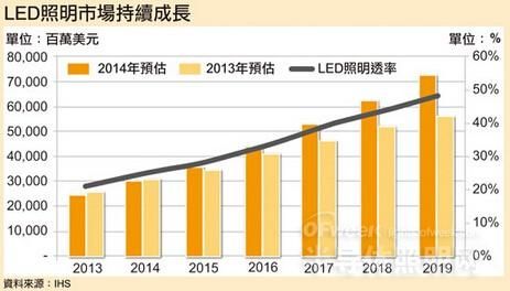 在天然资源逐渐被人类消耗殆尽,地球平均温度逐渐升高,导致圣婴现象频传的状况下,各国政府莫不积极投入绿色能源的开发,以及引进更省电设备。LED照明因具备高效率、环保省电,以及无闪烁、使用寿命长等特色,已成为取代传统白织灯泡的照明首选,也顺势带动LED绿能照明的产业前景,全球2014年LED照明产值约为178亿美元,较2013年成长68%,渗透率更一口气突破20%。 在LED灯具价格快速滑落的状况下,LED照明应用范围将会愈来愈大,根据LEDinside公布的研究报告指出,2015年全球照明市场规模将达821亿美元,其中LED照明应用可望达到257亿美元,市场渗透率达到31%。 值得注意的是,LED灯泡应用于汽车照明领域亦愈来愈大,日后可望成为LED照明应用的第二大市场。 家用照明陷入价格战 业者转战工业与商用